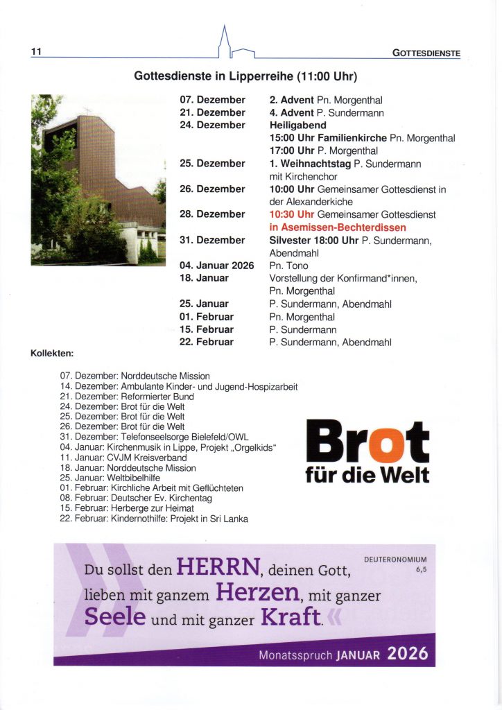 beginnen die Gottesdienste um 11:00 Uhr, ausser am 2. Sonntag des Monats, dann findet kein Gottesdienst in Lipperreihe statt, sondern im Dietrich-Bonhoeffer-Haus um 09:00 Uhr.