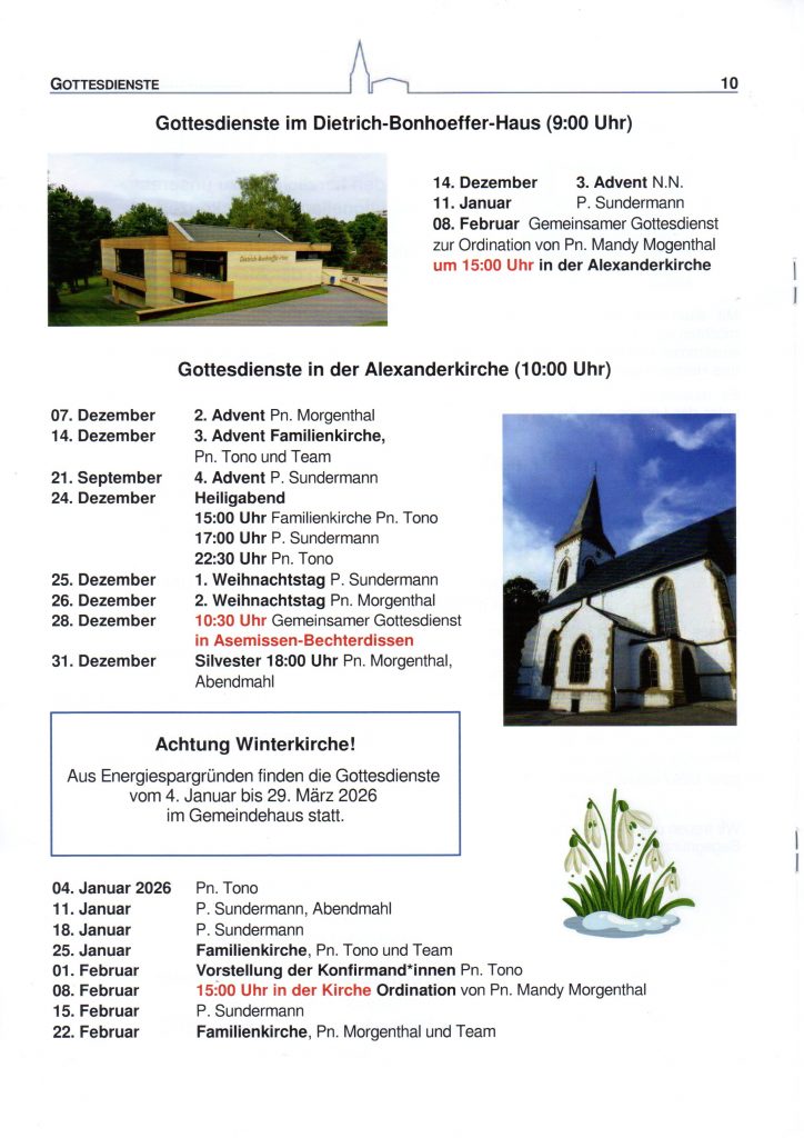 Gottesdienste in der Kirche Lipperreihe und im Dietrich-Bonhoeffer-Haus Der Gottesdienst in der Kirche Lipperreihe beginnt um 11.00 Uhr. Im Dietrich-Bonhoeffer-Haus findet der Gottesdienst jeweils am 2. Sonntag im Monat um 9.00 Uhr statt. An diesen Sonntagen ist dann in der Kirche Lipperreihe kein Gottesdienst.